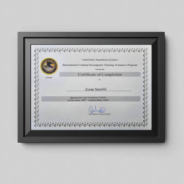 Takođe poseduje i sertifikat za sve vidove borbe protiv terorizma i pomoć u krivičnim istragama za specijalizovanu antiterorističku delatnost, što predstavlja garanciju u rešavanju svih kriznih situacija kao i Vaših problema s kojima se susrećete.