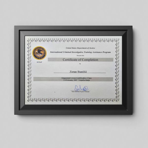 Poseduje veliki broj sertifikata i licenci kao i mnogobrojne zahvalnice iz oblasti bezbednosti među kojima su sertifikat Ministarstva pravde Sjedinjenih Država za detektivsku istragu u borbi protiv svih vrsta organizovanog kriminala i pomoć u kriminalističkoj istrazi za organizovani kriminal.